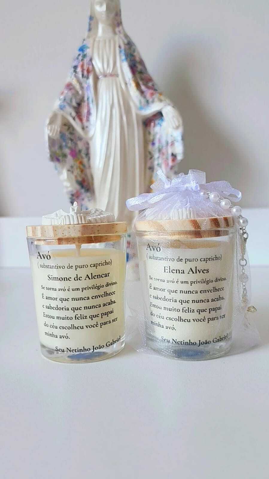 Cada vela vem em um copo de louça de vidro personalizado, onde nomes dos padrinhos e frases especiais para convite ou presente são delicadamente impressos, criando uma lembrança exclusiva e memorável.