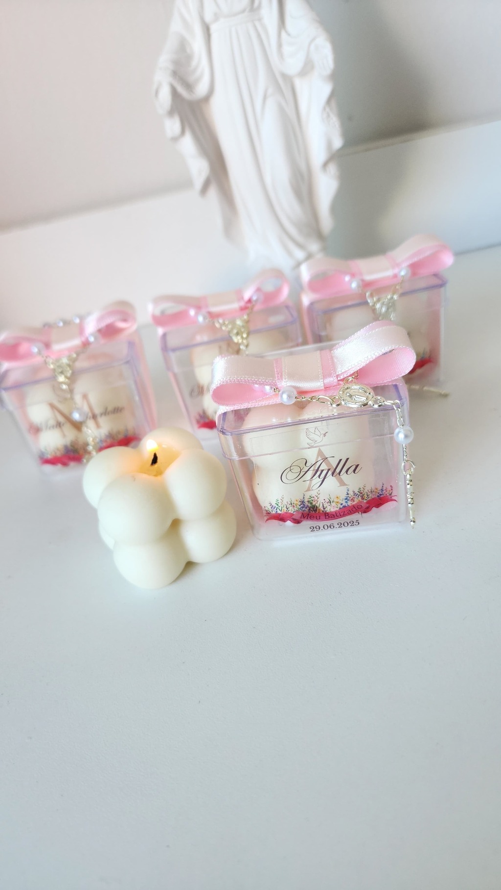 Este kit não é apenas uma lembrança, mas uma forma de expressar gratidão e carinho aos convidados. A combinação da vela aromática e do mini terço cria um presente significativo e memorável.