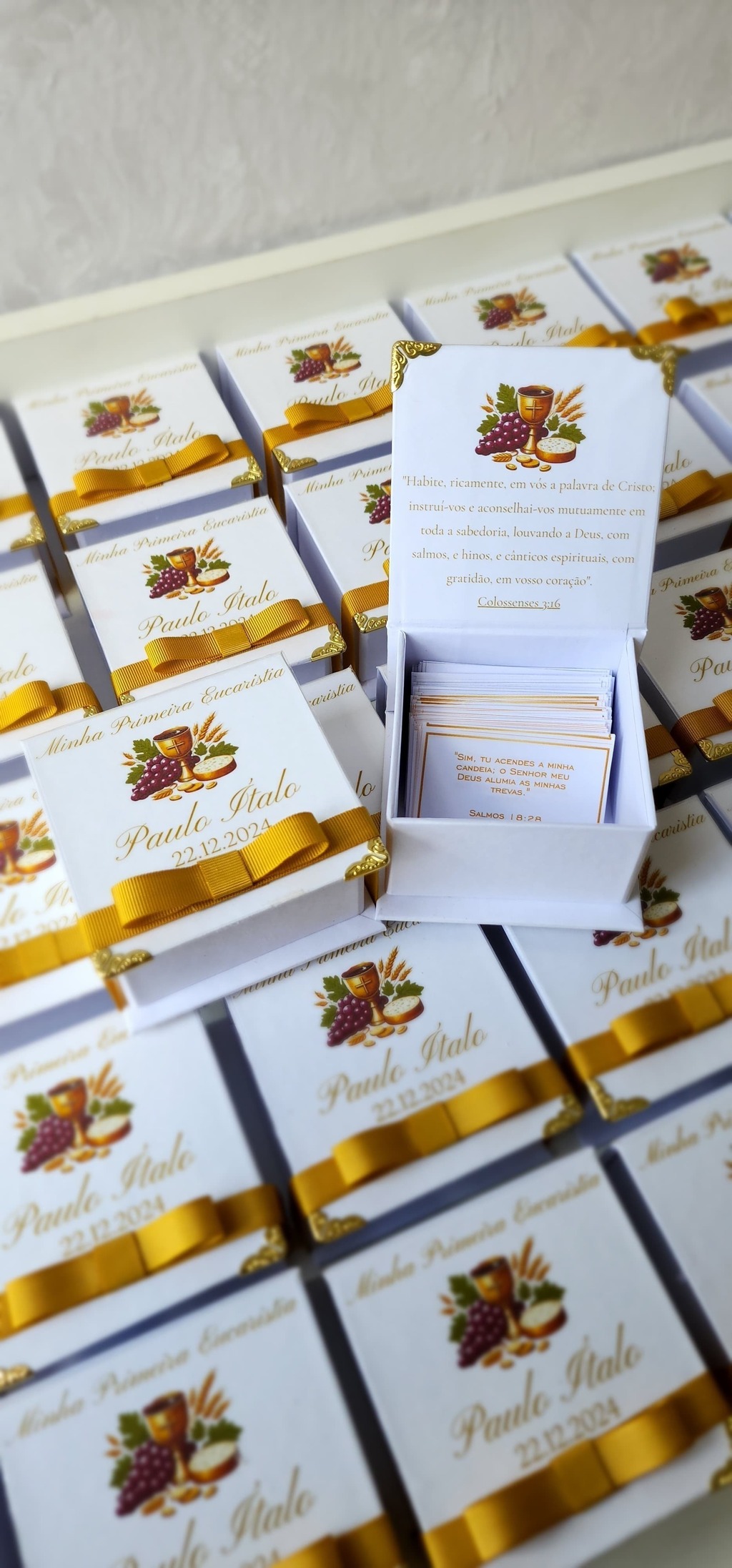 - Conteúdo: 10 caixas contendo 180 versículos bíblicos selecionados especialmente para o tema Eucaristia.